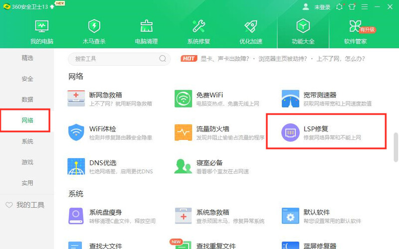 2.打开"360安全卫士"点击"功能大全"左侧的"网络",选择"LSP修复"进入;