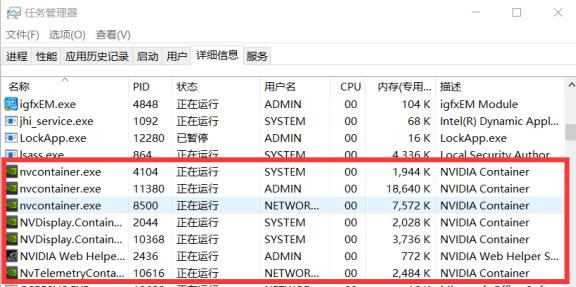 2.在"详细信息"页下找到和英伟达nvida有关的服务,将其全部设置为"打开"或者"自动";
