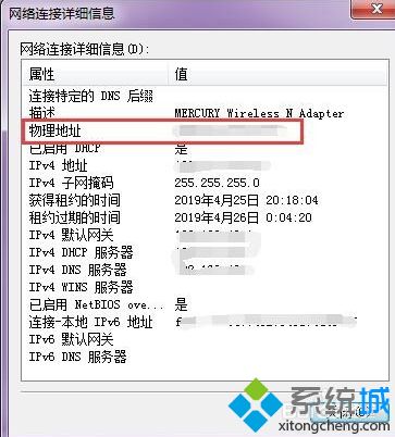 5、在详细信息的界面中,我们就可以看到我们的电脑的物理地址了,如下图红色框框所选的。