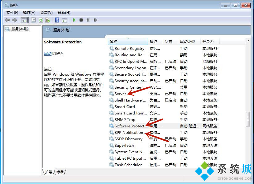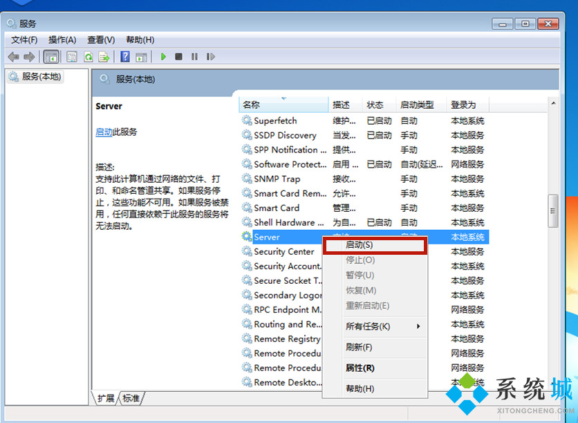 2.找到“server”功能,并且鼠标右键点击,在新菜单中中选择“启动”。之后将“Software Protection”和“SPP Notification Service”服务项同样设置为启动状态。之后重启电脑即可,此时win7桌面背景黑屏的问题就被顺利解决了。