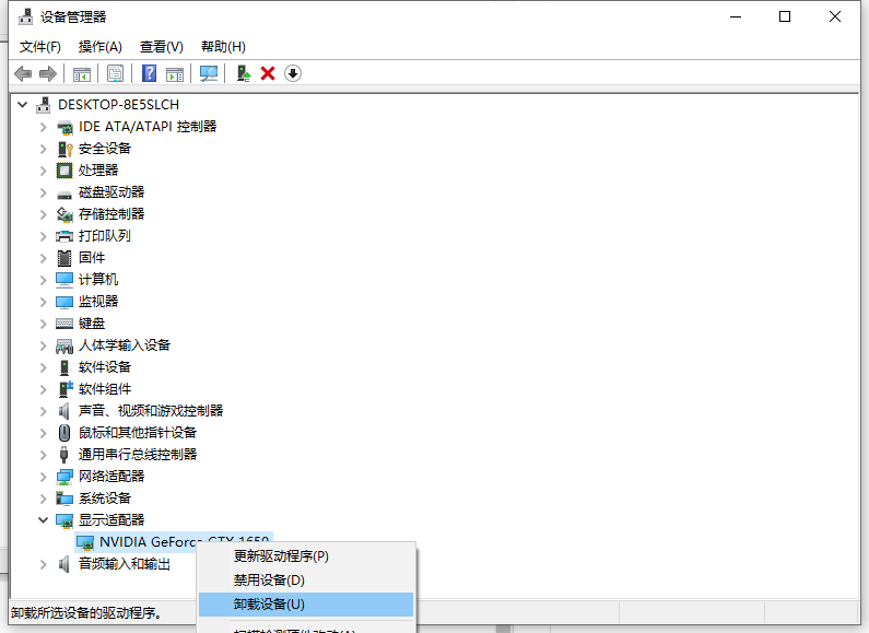 5. 右键单击你要卸载的显卡,选择卸载设备,如下图所示。