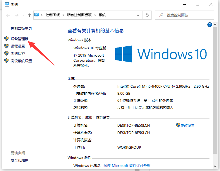 2. 属性面板点击设备管理器,如下图所示。