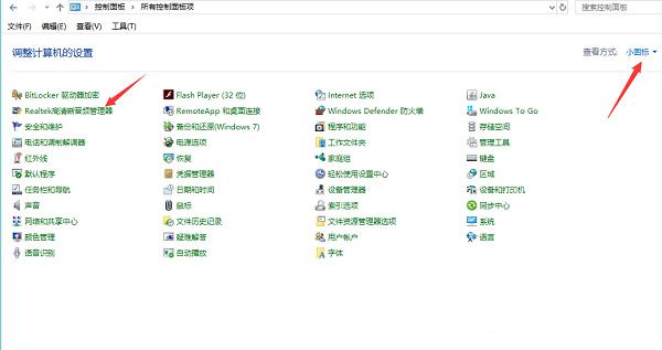 2、查看方式改为小图标。并选择Realtek高清晰音频管理器。