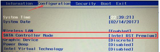 1、在安装系统前,进入电脑的BIOS界面(联想笔记本电脑:开机后立刻连续敲击F2键或者关机后通过novo小孔选择BIOS Setup),选择到Configuration页面,将SATA Controller Mode选项中的Intel RST Premium,改成AHCI。