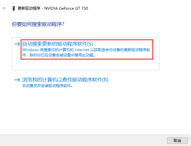 4、选择“自动搜索更新的驱动程序软件”。