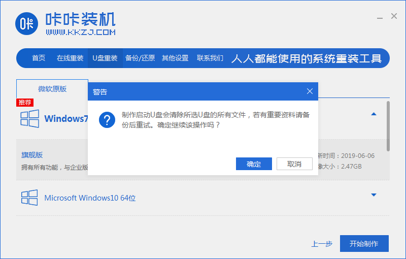 然后软件会提示我们u盘将会格式化,我们提前把资料备份好,点击”确认“即可。