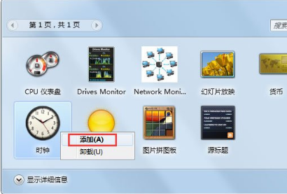 3、打开桌面小工具后,我们可以看到一些现有小工具; 在要添加单个鼠标右键的小工具上,将弹出选项,添加或卸载,选择添加以添加此小工具;