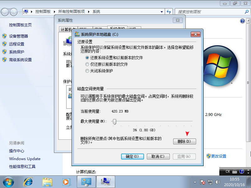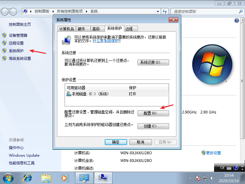 3、我们也可以右键计算机,选择属性,点击系统保护,点击配置选项,在点击删除选项即可。