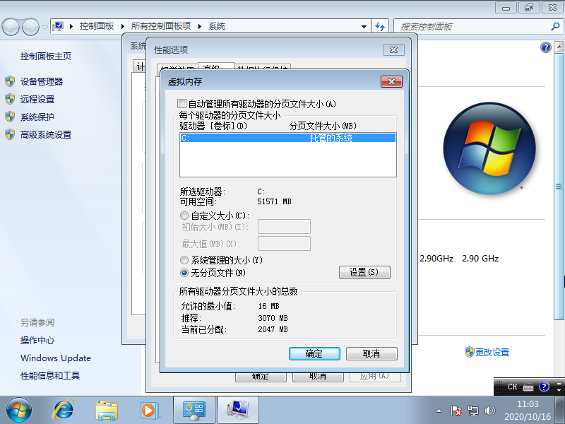 6、接着我们取消勾选第一项,然后选中c盘,选择无分页文件,在设置一个最大值和最小值,再点击确定。
