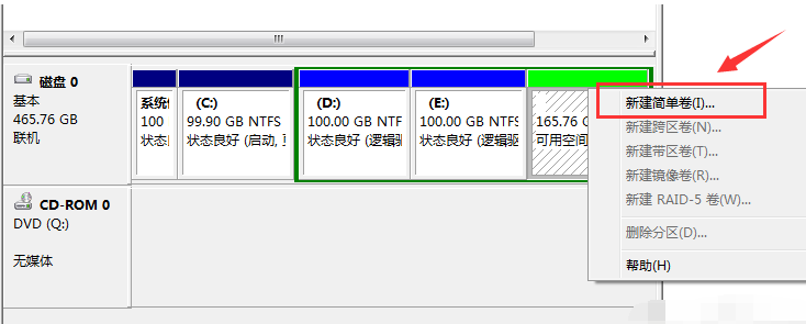 6、完成由一个分区变成两个分区之后,需要把大的分区再进行小分区。先进行格式化,使之变为“可用空间”,然后右击,选择“新建简单卷”。