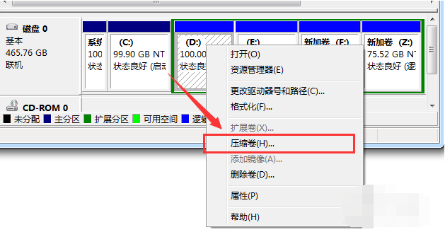 4、我们右击磁盘选择选择“压缩卷”调整分区大小。