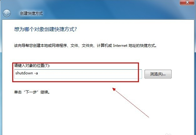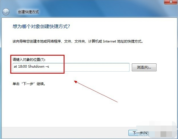 2、点击【快捷方式】后:输入【at 18:00 shutdown -s】在对像位置。 注:里面的18:00就是18点关闭电脑。以后也是到这个时间也会自动关机的。