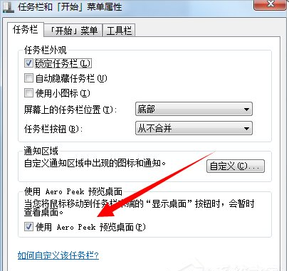 2、进入任务栏界面,将【使用Aero peek预览桌面】选项关闭,点击确定。