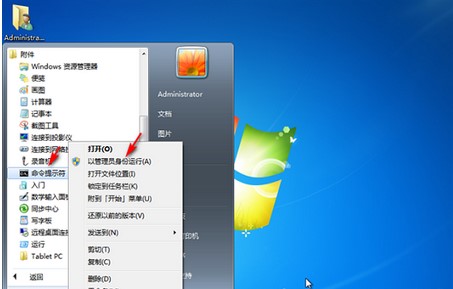 2、以后点击开始按钮,挑选命令提示符,以管理员的身份运作。