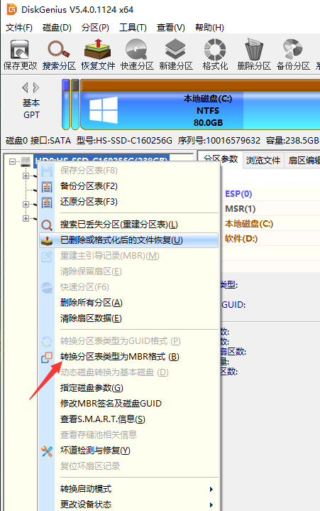 5、然后使用相同的方法,右击硬盘,点击转换分区表类型为MBR格式。(再将分区表转换回来,不然有些系统安装会报错)