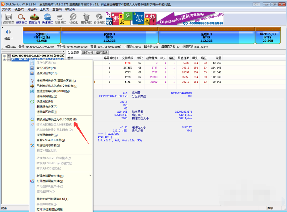 3、右击要转化分区的磁盘,选择转换分区表类型为GUID格式.