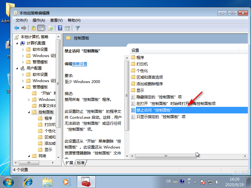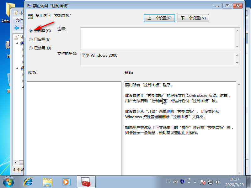 3、之后在右侧点击“禁止访问”控制面板”策略”,选择“未配置”或“已禁用”,点击确定就可以了。