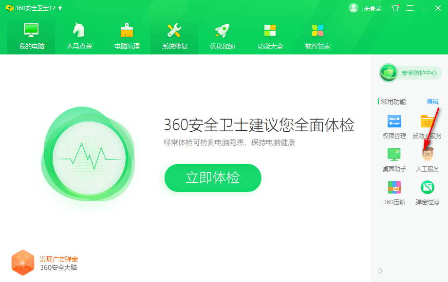 1、首先下载并安装一个360安全卫士,进入后打开人工服务。