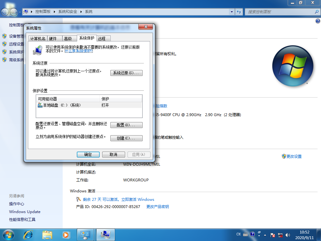 2.在弹出的窗口中点击系统保护,根据自己的需要选择保护设置。