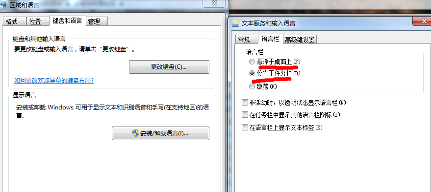 6、接下来我们找到语言栏,选择悬浮于桌面或停靠任务栏,再点击确定就好啦。