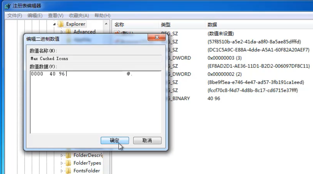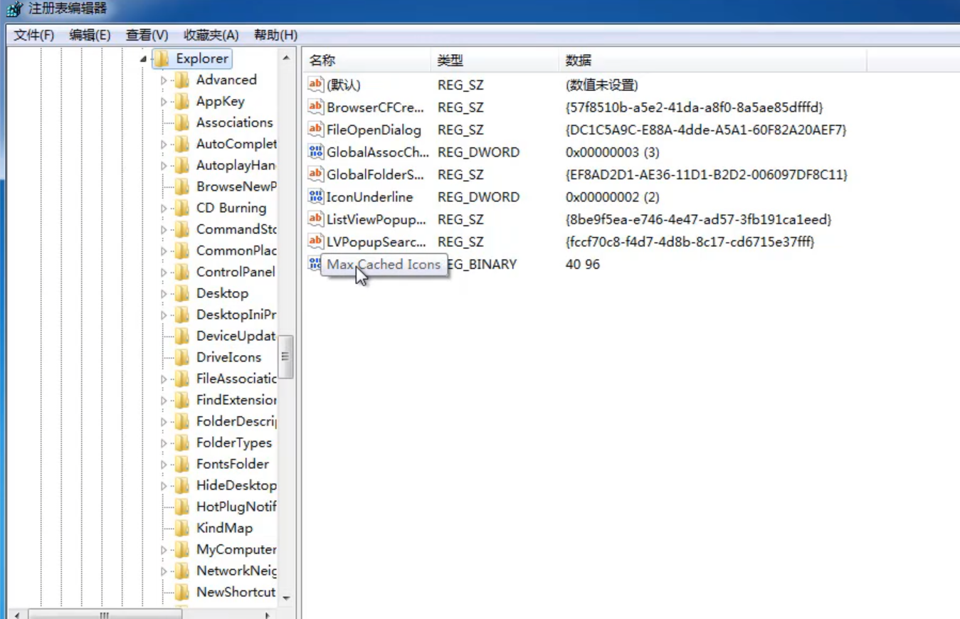 2.进入后依次打开计算机,HKEY-LOCAL-MACHLINE,SOFTWARE,Microsoft,Windowws,CurrentVersion,Explorer,在右侧双击Max Cached lcons,如果没有就新建。