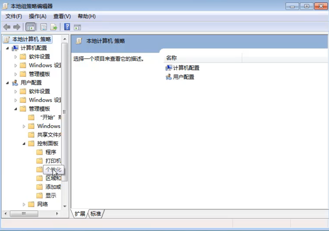 2.进入后点击用户配置下方的管理模板,再点击控制面板,点击个性化。