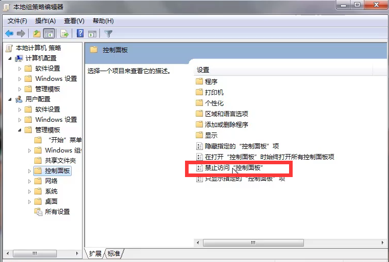 5、找到用户设置--管理模板--控制面板,双击里面的“禁止访问控制面板”。