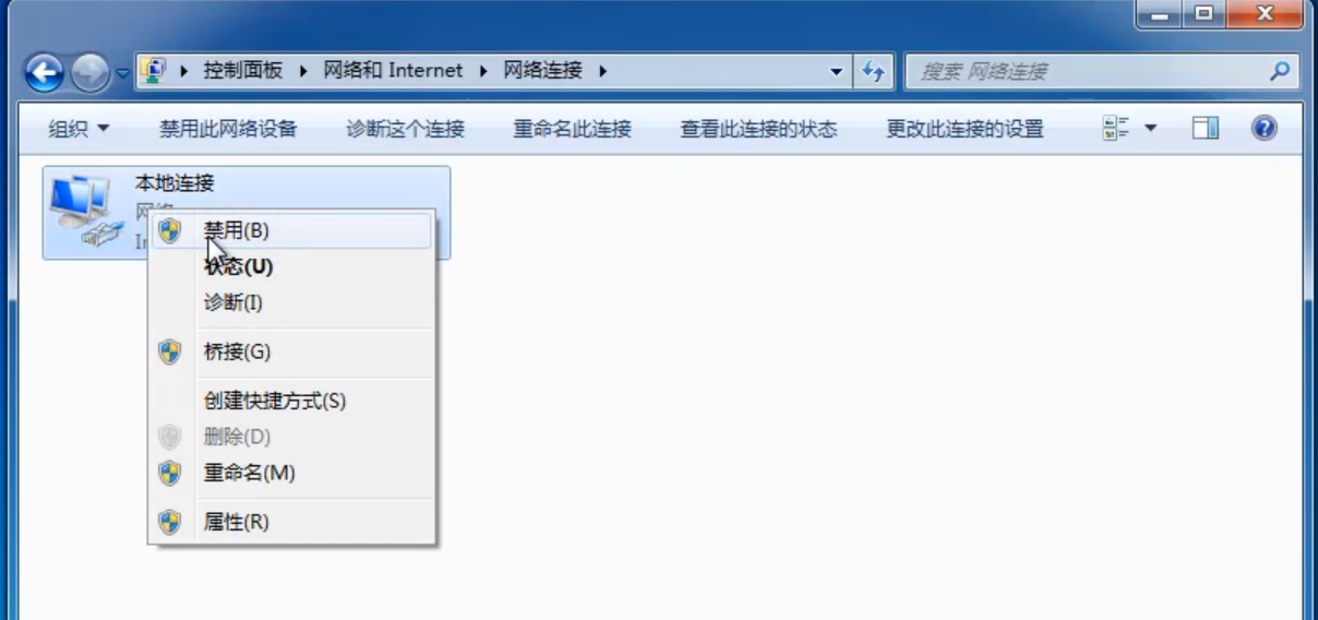 2.进入后点击左侧菜单中的更改适配器设置,右键单击本地连接选择禁用即可。