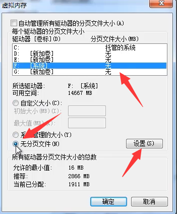 5、选择提示参数错误的盘,然后点击“无分页文件”,之后点击设置,最后点击确定,然后重启计算机即可。