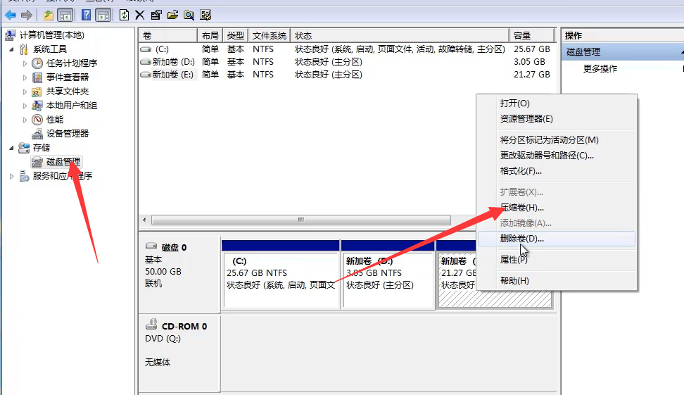 2、在磁盘管理下选择需要分配的磁盘后右击选择压缩卷。