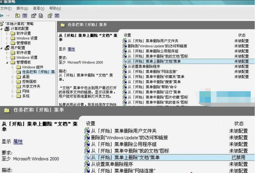 而有些时候,在方法一中,开始菜单的属性设置就没有“我最近打开的文档”的选项,那么此时的解决方法:【运行】--输入【gpedit.msc】--【本地计算机策略】--【用户配置】--【管理模板】--【任务和开始菜单】--【从开始菜单中删除文档菜单】,选【禁用】即可。这时,开始菜单中就会直接出现“我最近打开的文档”。