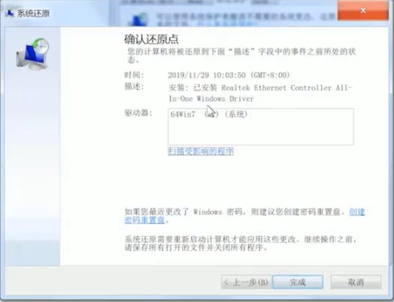 4、确认还原点的信息无误之后,点击完成,系统就会开始还原。