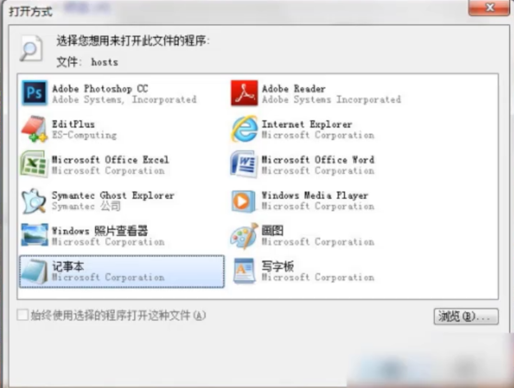3、然后双击hosts文件,选择以记事本方式打开。
