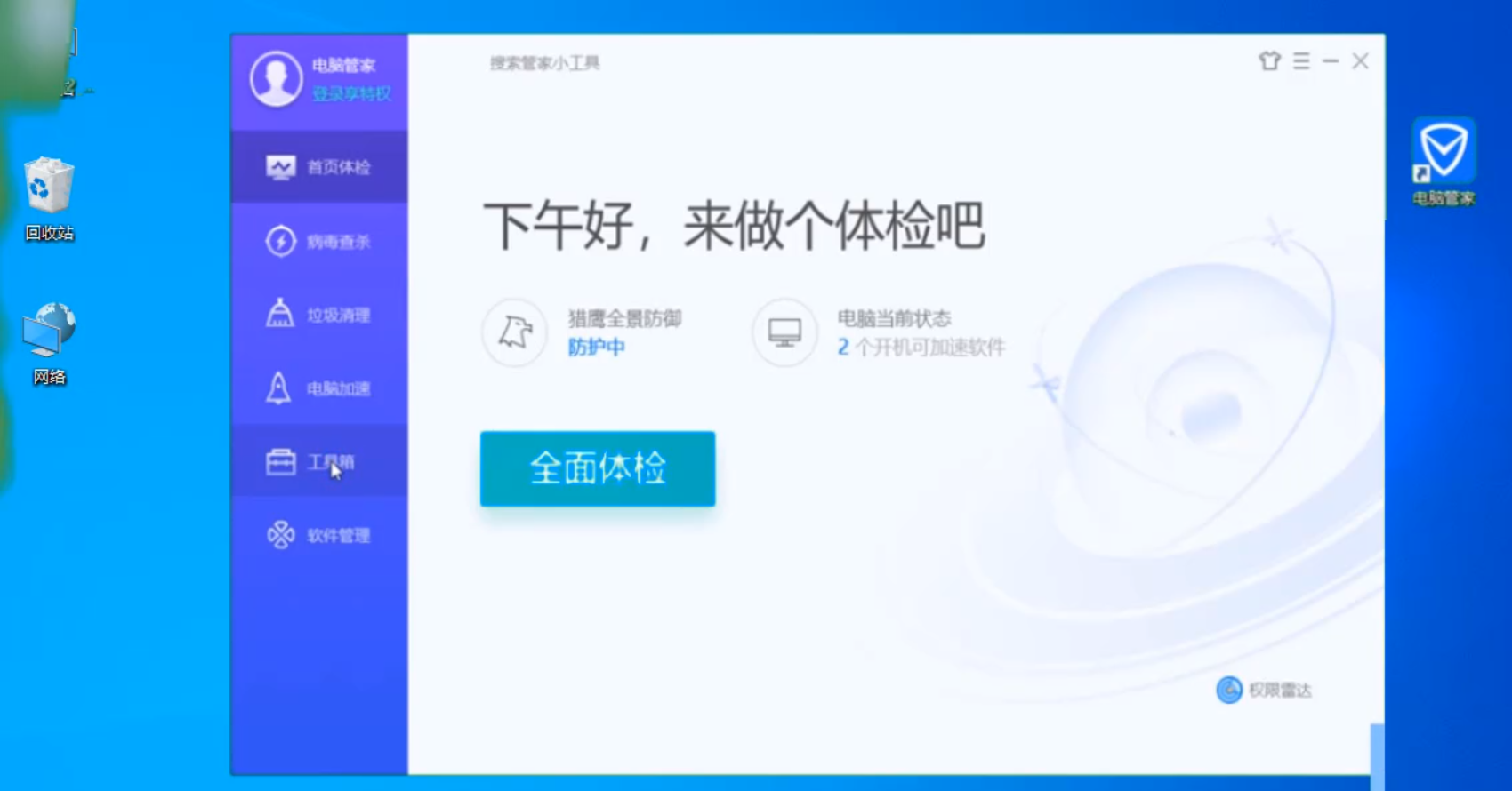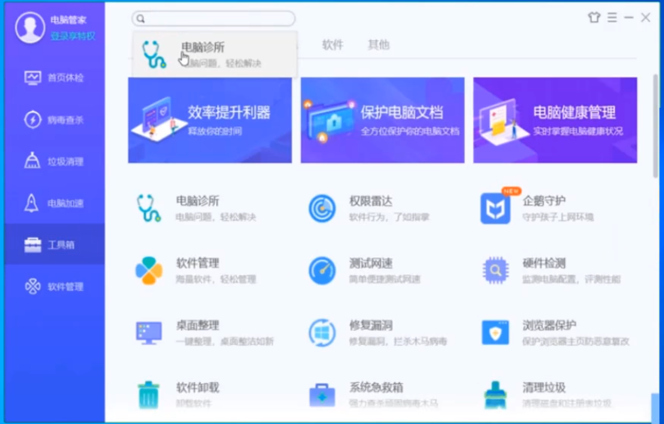 1.首先打开电脑管家,点击工具箱,搜索并点击电脑诊断功能打开。