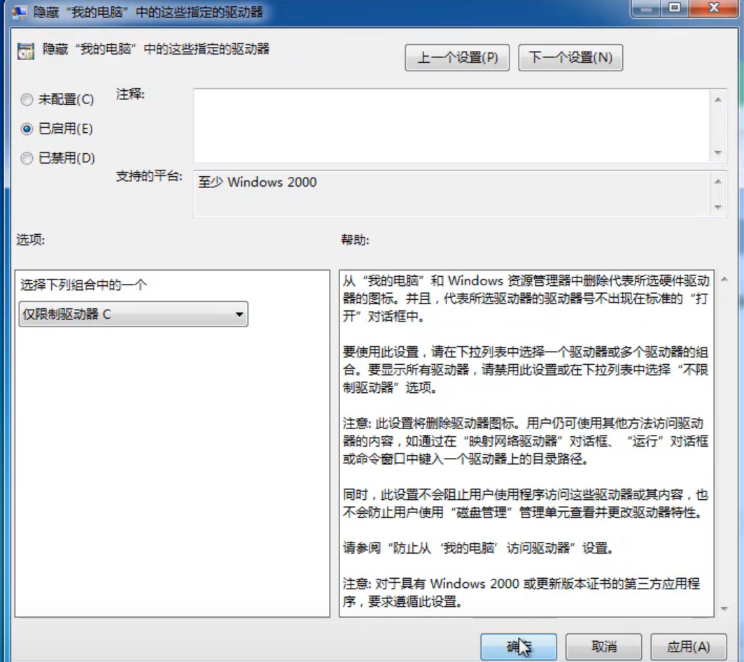 5.最后在选项框里选择“仅限制驱动器C”,点击确定。