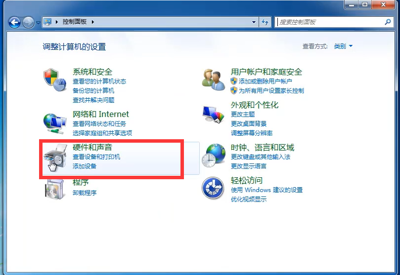 3、点击硬件和声音。