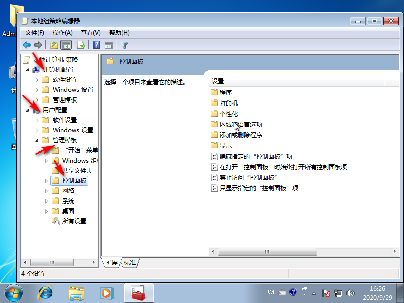 2、进入后点击左侧的“用户配置-管理模板-控制面板”。