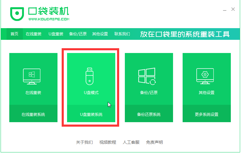 2、打开口袋装机软件前,退出电脑上所有安全杀毒软件,之后在双击打开口袋装机工具,点击U盘模式。
