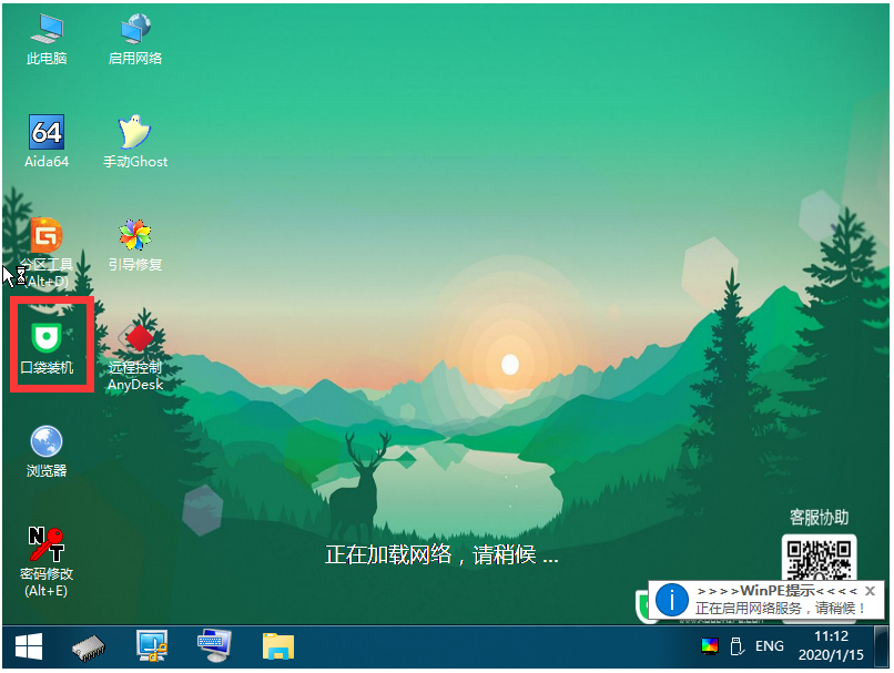 9、等待口袋PE加载完成,打开桌面上的口袋装机。